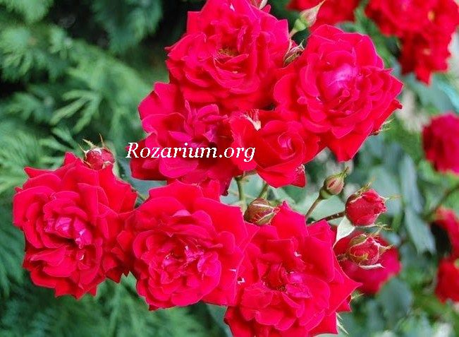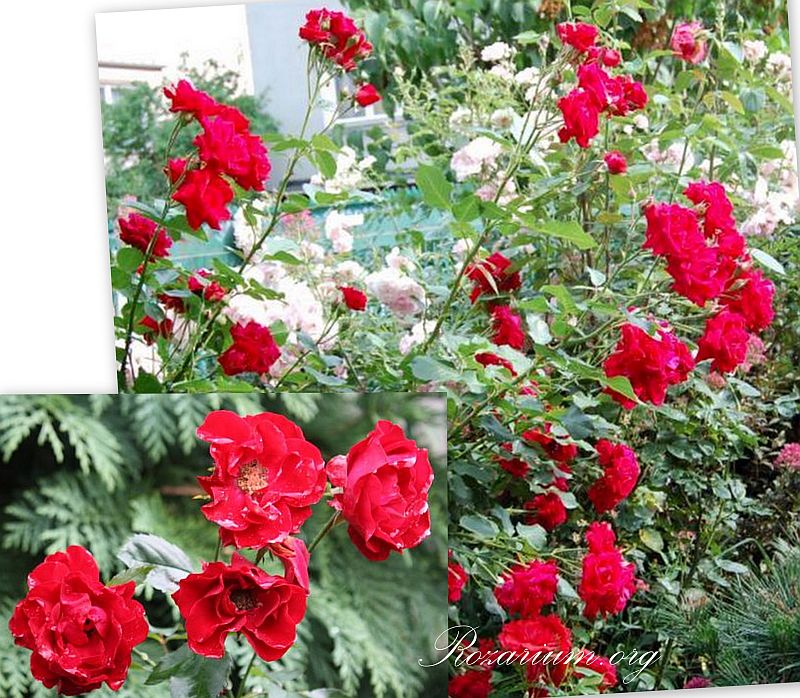 Kwitnie obficie kilka razy w sezonie. Kwiaty półpełne o 28 płatkach, krwistoczerwone, zebrane w duże kwiatostany.
