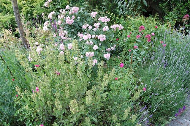 Krzew róży Bonica 82 na rabacie mieszanej. Dodatki: lawenda, szałwia i ostrogowiec.