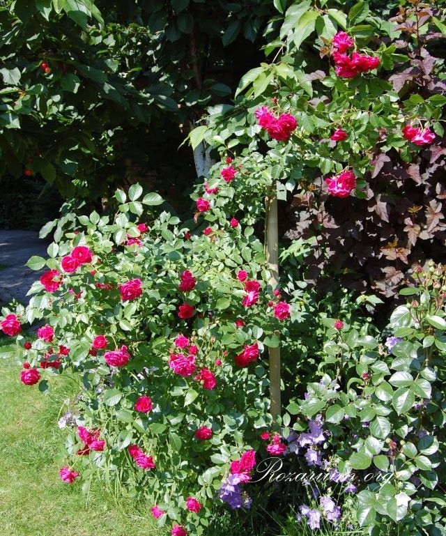 Róża parkowa, hodowca Kordes 1951. Róża piżmowa/Hybrid musk. Lambertiana. Krzyżówka: Hamburg x Verdun. Bardzo zdrowa i witalna odmiana odznaczona ADR w 1950 roku. Jedna z najsilniej rosnących i najobficiej kwitnących róż w moim ogrodzie. Kwiaty średnicy 5 cm i 20 płatkach, intensywne ciemnoróżowe rozwijają się w bardzo dużych pękach (do 40 sztuk) i bardzo długo utrzymują się na pędach. Zapach delikatny, piżmowy. Kwitnienie jesienne w intensywniejszych kolorach. Liście średniej wielkości, błyszczace. Pokrój krzewu rozłożysty, pędy przewieszają się na boki. Wysokość i szerokość dorosłego krzewu – 2m. Strefa mrozoodporności 4-9 USDA. Przetrwała już 10 zim bez większych uszkodzeń mrozowych (jedynie czubki pędów trzeba podciąć wiosną). Wyjatkowa odmiana pod każdym względem! Nie wymaga szczególnej pielęgnacji. Równie dobrze rośnie na gorszych stanowiskach i w półcieniu. Rośnie u mnie zdrowo, bardzo rzadko choruje, tylko podczas długotrwałych upałów zdarza się mączniak właściwy na końcach pędów. Ogólnie bezproblemowa róża, wymagająca minimum zabiegów pielęgnacyjnych. Polecam szczególnie dla poczatkujących miłośników róż.