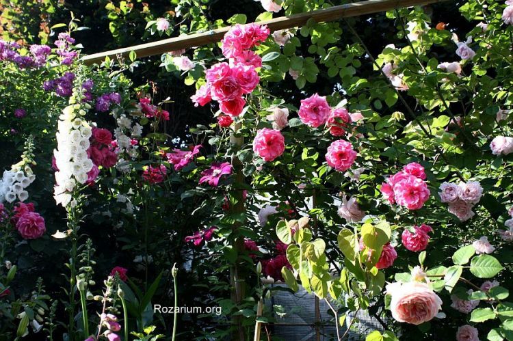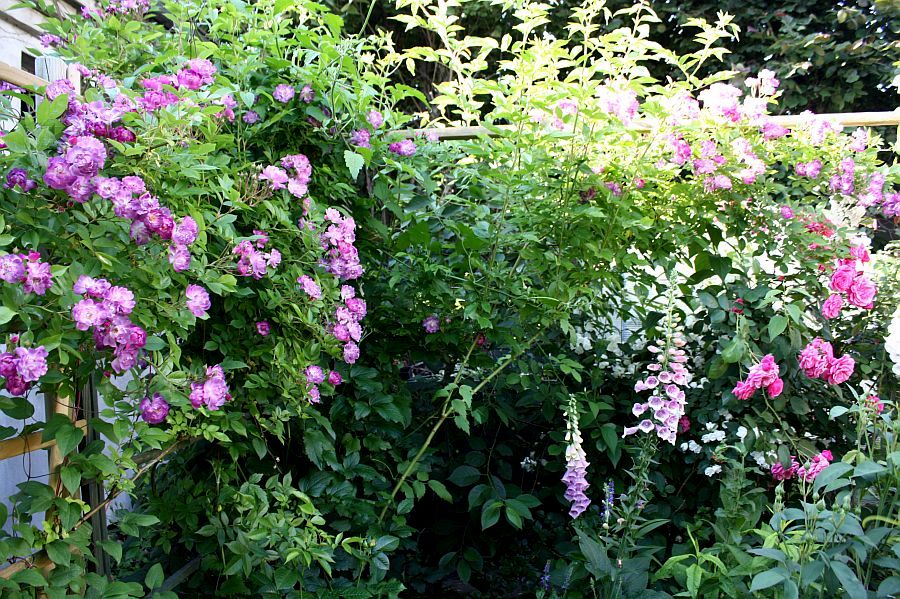 Po obejrzeniu wielu zdjęć ze szkółek i ogrodów różanych, moim marzeniem jest utworzyć z róż pnących tzw. ścianę kwiatów. Na pewno trzeba uzbroić się w cierpliwość, bo róże potrzebują kilku ładnych lat aby się rozrosnąć. Minimum to trzy, cztery lata, a im starsze tym lepszy efekt. Róże rosnące u mnie od strony północnej mają od trzech do ośmiu lat. W tym roku nareszcie dają popis kwitnienia. Ciepło i słońce po dużej dawce wilgoci zrobiły swoje! Patrząc od lewej rosną: Veilchenblau, pnaca NN o ciemnoróżowych kwiatach, Constance Spry- róża angielska o wspaniałym zapachu mirry i najmłodsza w szeregu: Moonlight Kordesa- odmiana o niesamowitym wigorze! Kroku dotrzymują im naparstnice, dzwonki i goździki brodate.