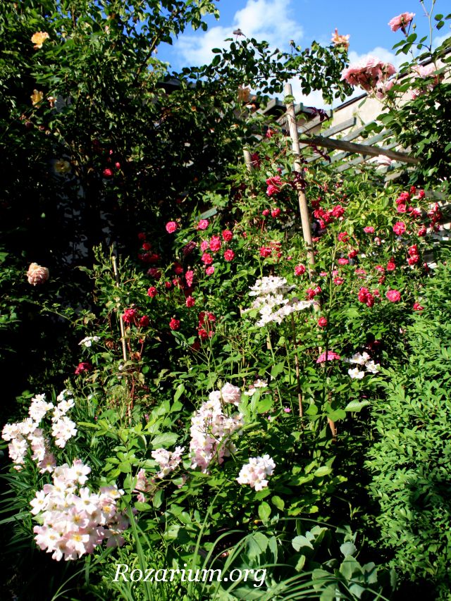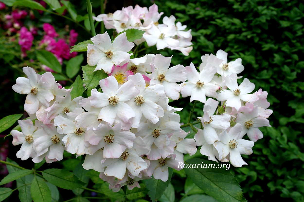 Ballerina najlepiej komponuje się z podobnymi różami o drobnych, pojedyńczych kwiatach, jak Mozart, Robin Hood, Nozomi. Można ją posadzić u podnóża róż pnących, drobno kwitnących ramblerów. Na zdjęciu poniżej przykład takiego połączenia: Ballerina i róża pnąca Super Excelsa- obie odmiany powtarzają kwitnienie przez cały sezon do mrozów.
