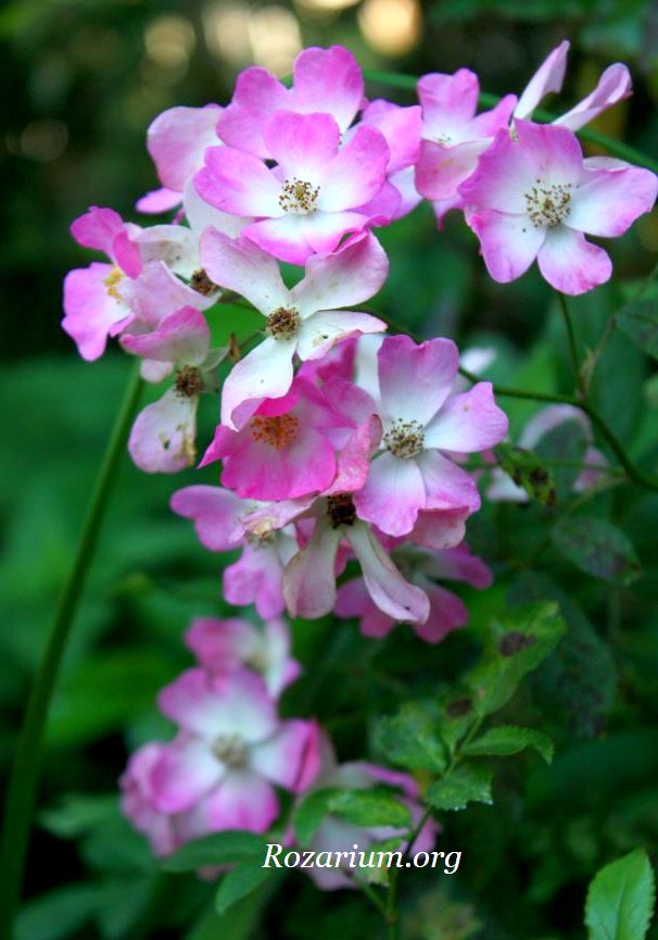 Róża piżmowa (Bentall 1937), krzaczasta, osiąga wysokość do 1,5 m a czasem więcej w ciepłym klimacie. Pochodzenie nieznane. Wydaje dużo pędów tworząc gęsty, rozłożysty krzew. Łatwa w uprawie, kwitnie obficie kilka razy w sezonie. Kwiaty lekko pachnące w dużych baldachach, małe, jasno różowe z białym oczkiem i żółtymi pylnikami, jaśniejące w słońcu. Jesienią krzew zdobią pomarańczowe owoce wielkości grochu.