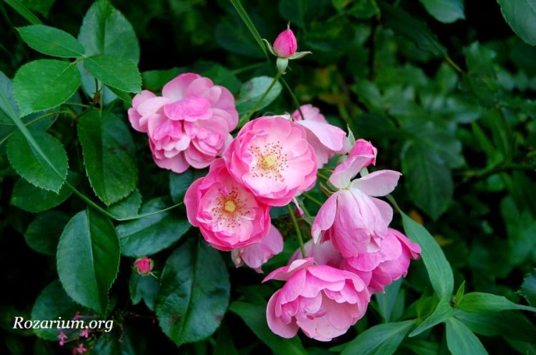 Róża piżmowa (Bentall 1937), krzaczasta, osiąga wysokość do 1,5 m a czasem więcej w ciepłym klimacie. Pochodzenie nieznane. Wydaje dużo pędów tworząc gęsty, rozłożysty krzew. Łatwa w uprawie, kwitnie obficie kilka razy w sezonie. Kwiaty lekko pachnące w dużych baldachach, małe, jasno różowe z białym oczkiem i żółtymi pylnikami, jaśniejące w słońcu. Jesienią krzew zdobią pomarańczowe owoce wielkości grochu.