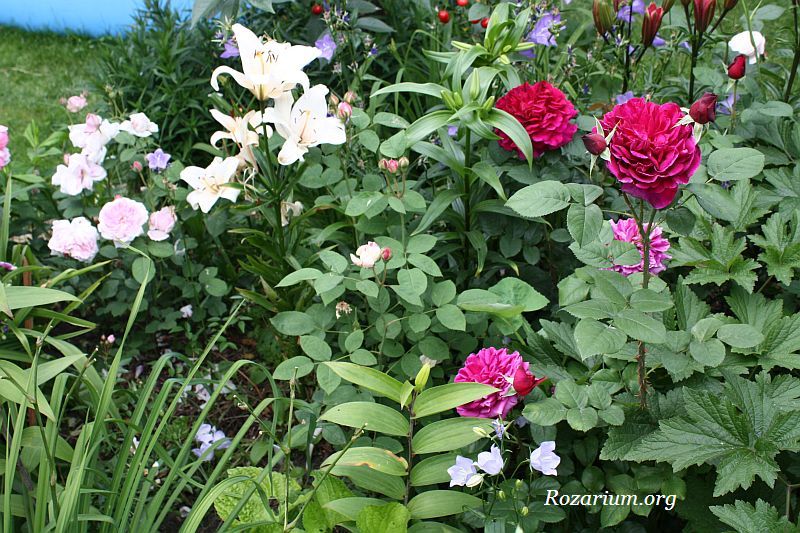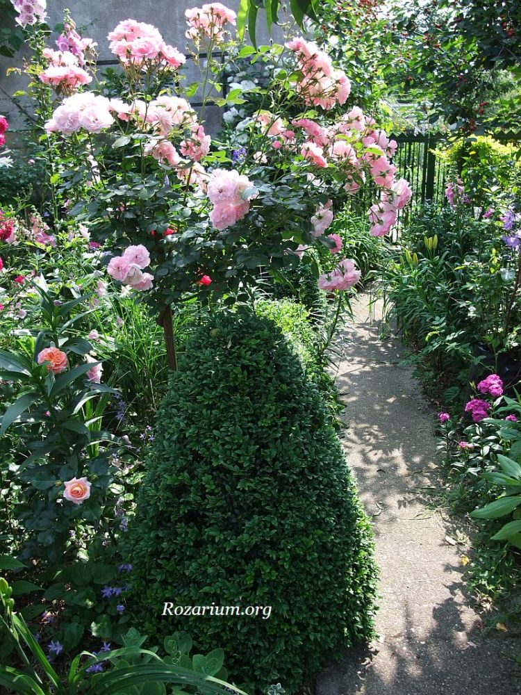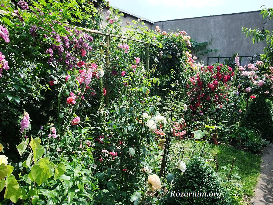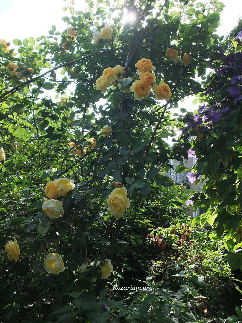 Przy róży Veilchenblau rośnie Clematis ‘Praecox’ z grupy Heracleifolia oraz Clematis Proteus.